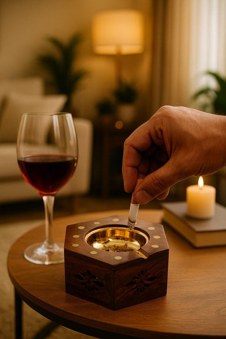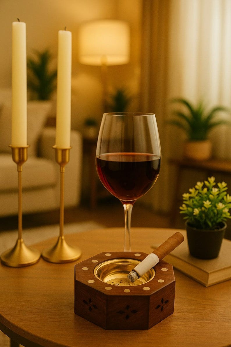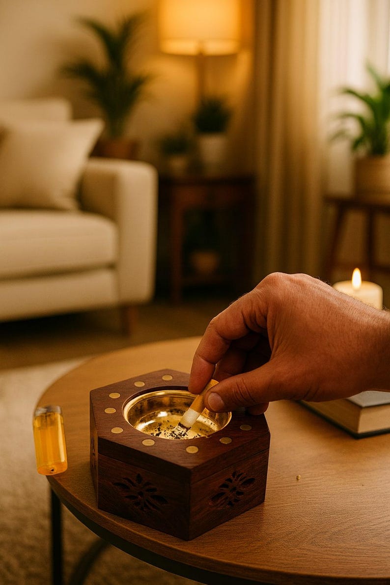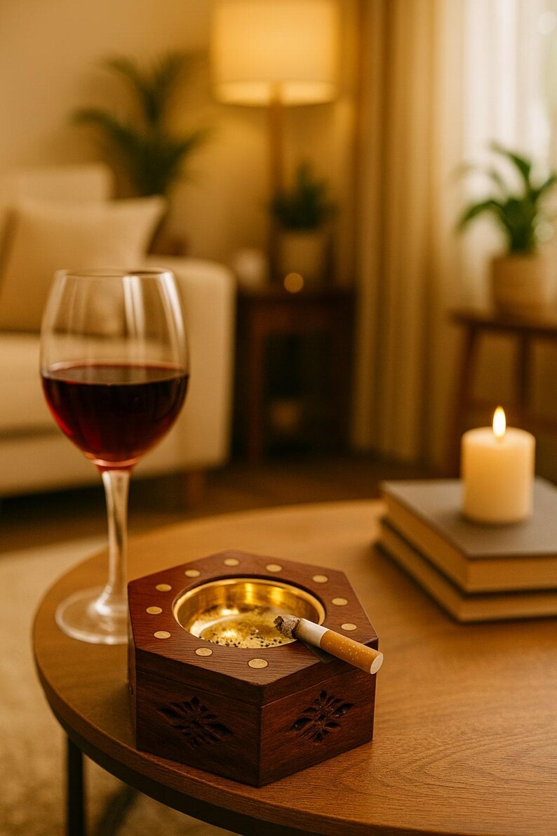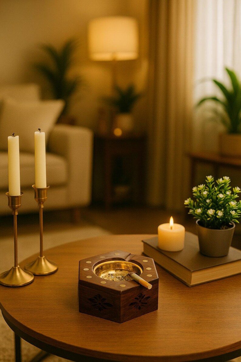 Bring timeless elegance to your smoking ritual with this handcrafted rosewood ashtray, designed to enhance both your space and your experience. The hexagonal shape and brass inlay give it a refined, vintage charm, making it ideal for classy gatherings, personal relaxation, or gifting on special occasions. Perfectly suited for cigars or cigarettes, this decorative ashtray doubles as a sophisticated home décor piece.