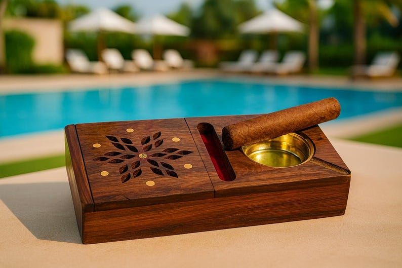Elevate your cigar ritual with this handcrafted rosewood cigar humidor and ashtray set — a perfect blend of craftsmanship and class. Designed to suit both elegant indoor settings and relaxed outdoor environments, it offers a refined way to store, display, and enjoy your cigars. From the warm tones of the wood to the gleam of the brass ashtray, every detail reflects timeless luxury.